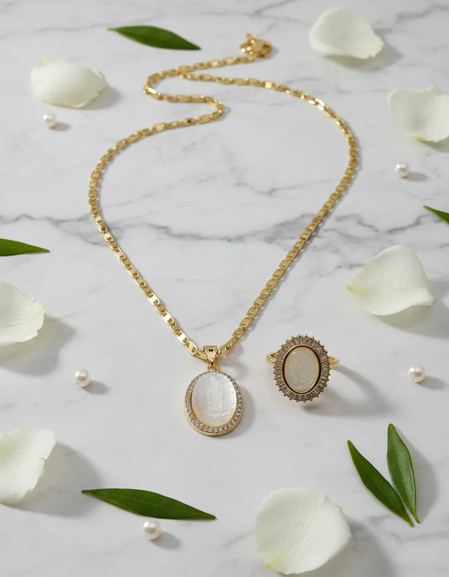 cadena laminada y medalla madre perla adornada con zirconias alrededor.