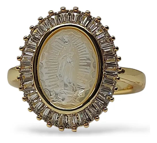 Imágen virgen tallada en concha adornada con piedras alrededor