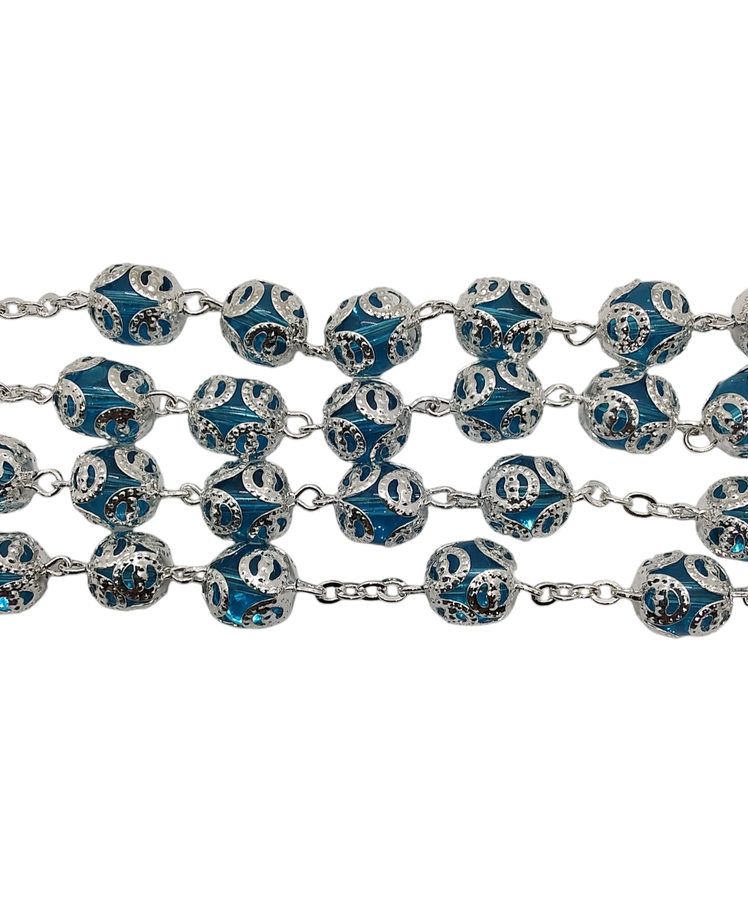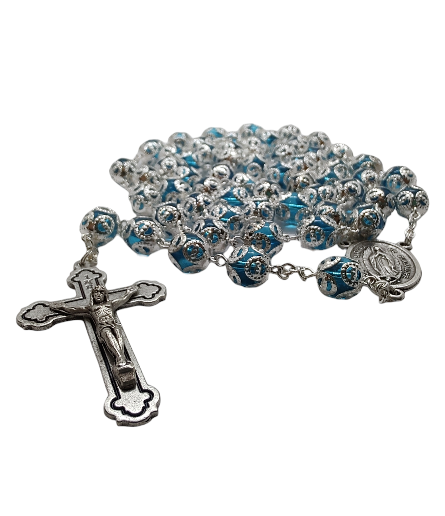 Rosario de vidrio con capuchón de alpaca en cada cuenta. Disponible en varios colores. Incluye cajita de plástico .